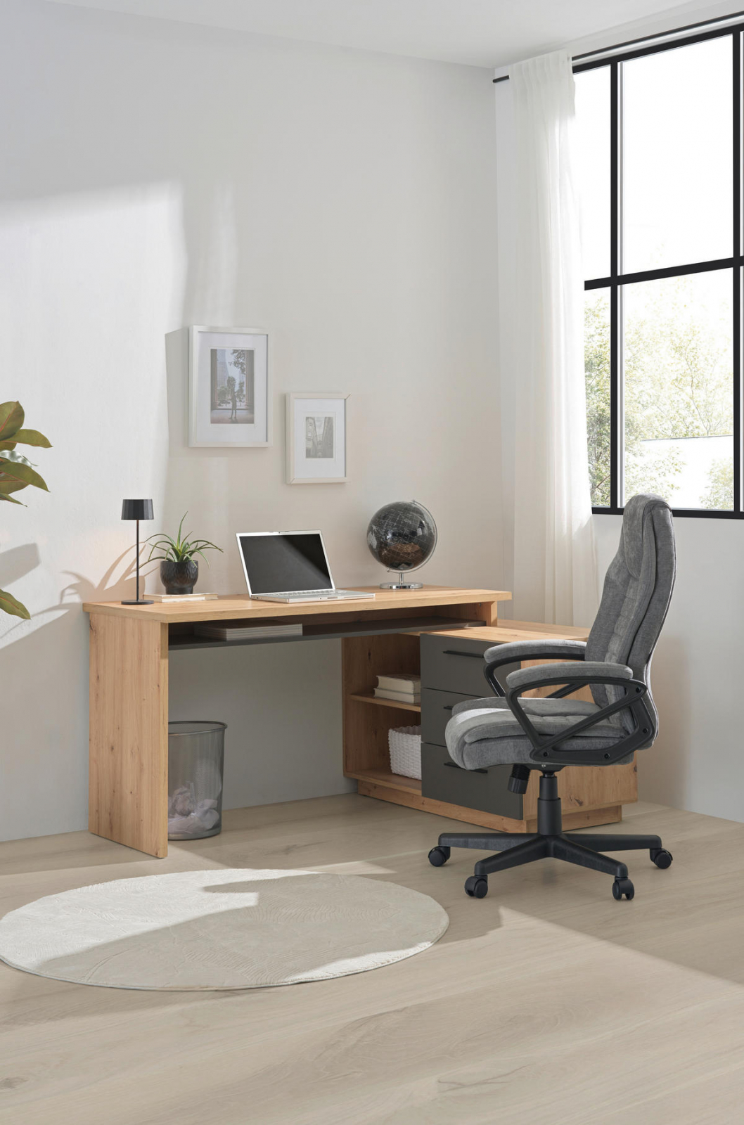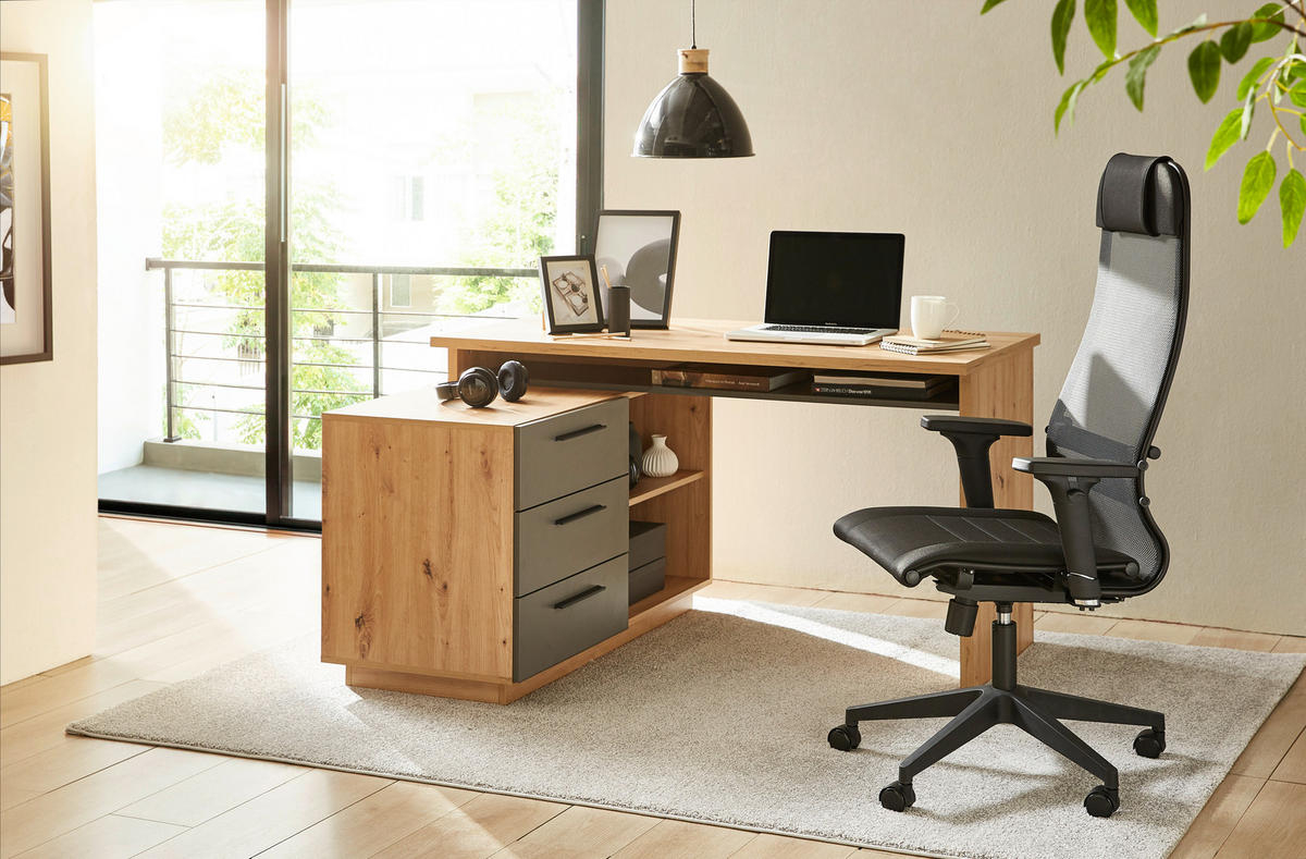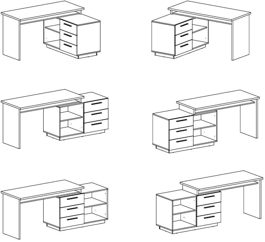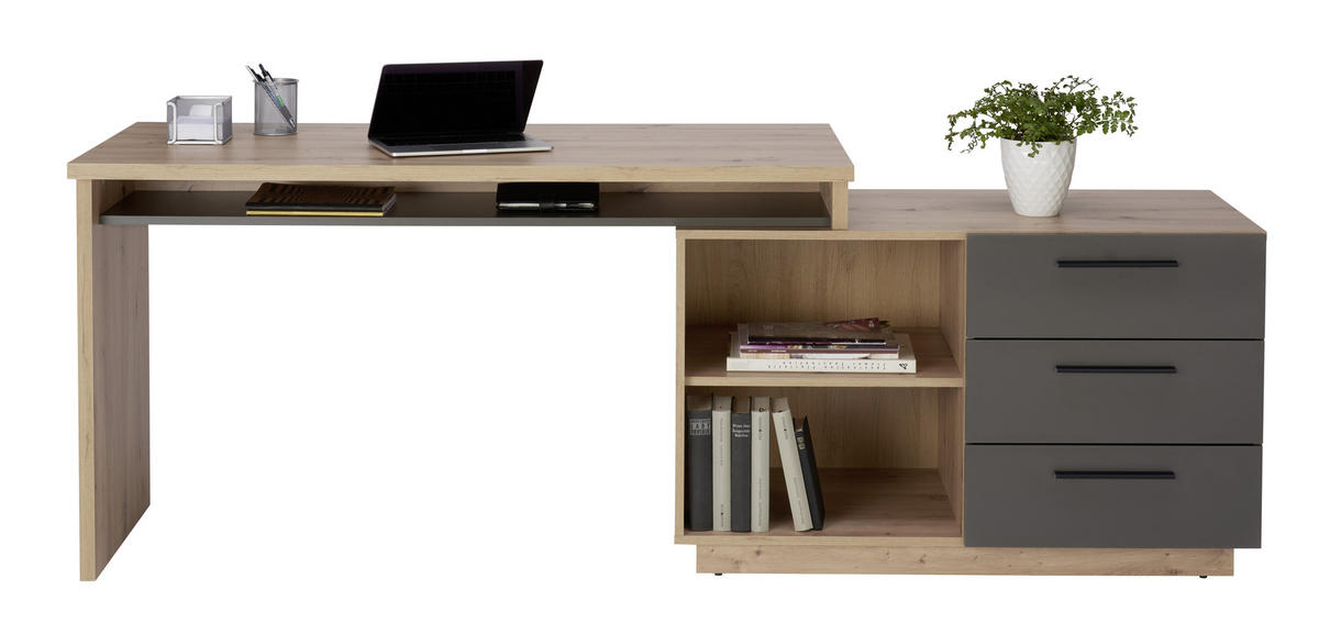 Cu un aspect elegant în nuanțe de antracit și stejar Artisan, acest birou este soluția ideală pentru spațiul tău de lucru sau studiu. Designul său versatil îți permite să îl montezi în oglindă, în funcție de configurația camerei – un avantaj esențial în amenajările flexibile.