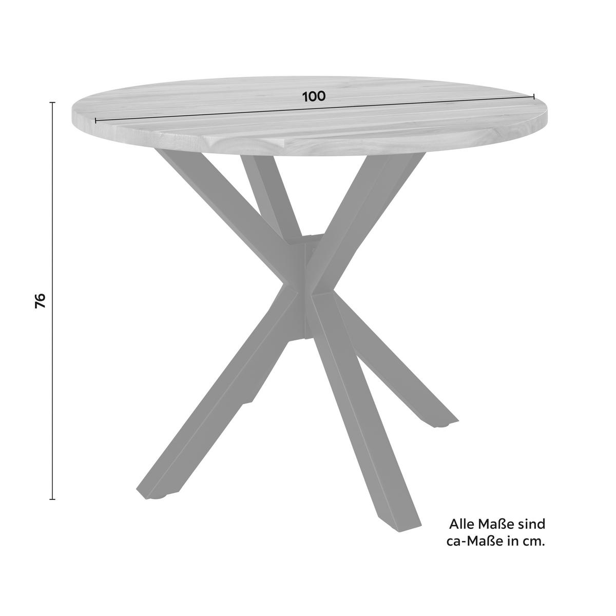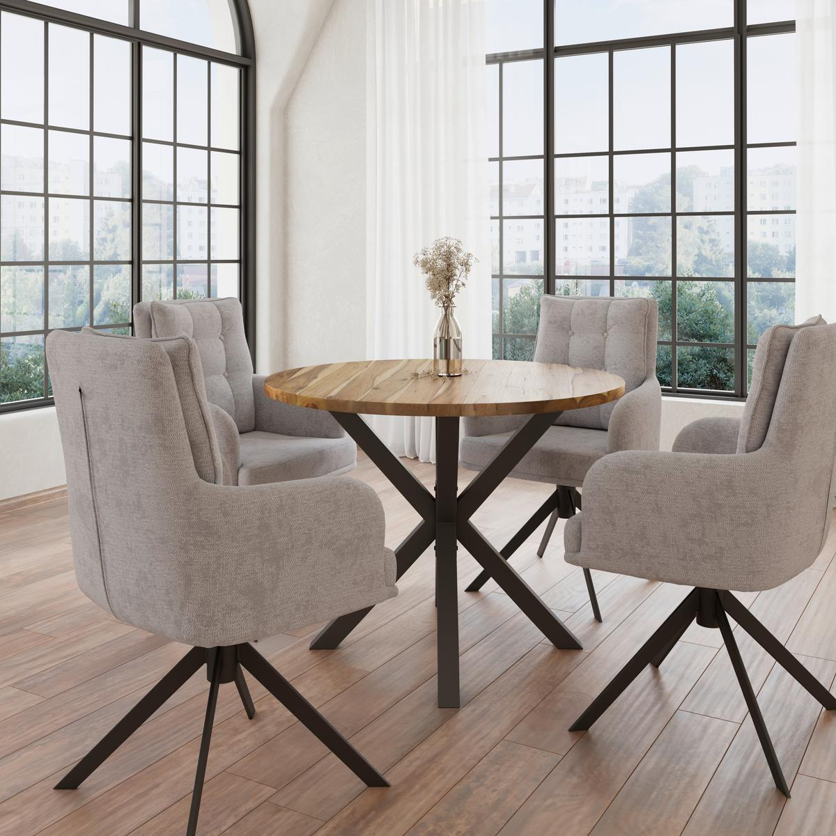 Această masă rotundă din lemn masiv de acacia aduce un plus de naturalețe și eleganță oricărui interior. Blatul gros, cu finisaj natural, evidențiază frumusețea lemnului, iar picioarele din metal oferă stabilitate și un contrast modern, perfect echilibrat.