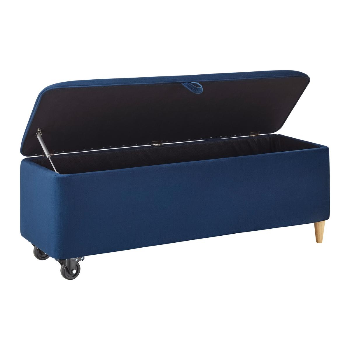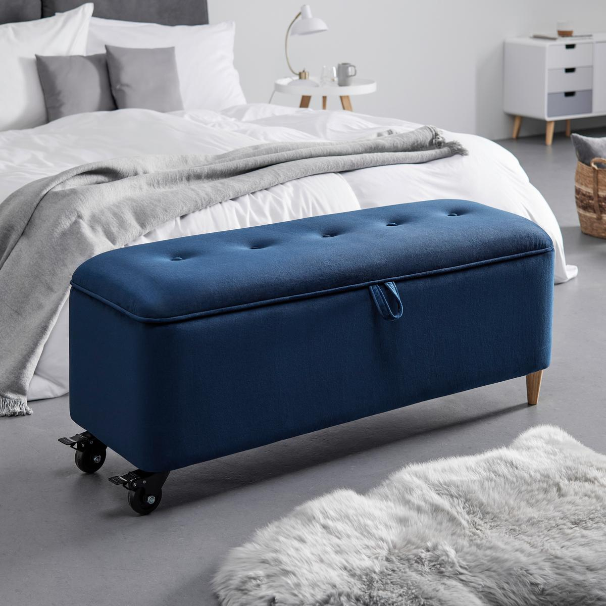 Această băncuță albastră aduce un plus de stil și funcționalitate în orice cameră. Tapițeria din catifea oferă un aspect sofisticat, în timp ce structura din lemn masiv de eucalipt asigură stabilitate și durabilitate. Sub șezut se află un spațiu generos de depozitare, perfect pentru perne, pături sau alte obiecte de uz zilnic.