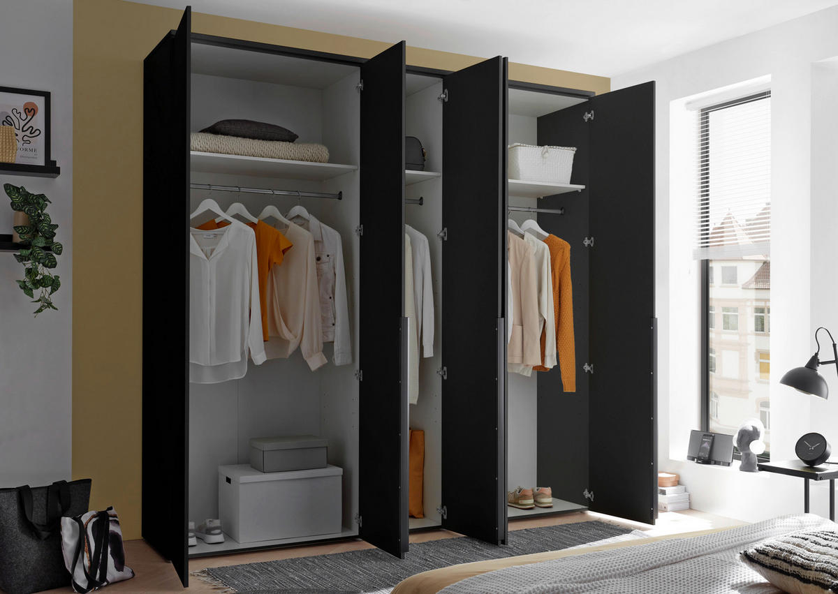 Acest dulap cu uși batante este ideal pentru amenajarea practică a dormitorului sau dressingului, datorită designului său în unghi și finisajului modern în culoare grafit. Oferă o capacitate amplă de depozitare pentru haine, accesorii sau lenjerii, fiind dotat cu rafturi spațioase și bare pentru umerașe.