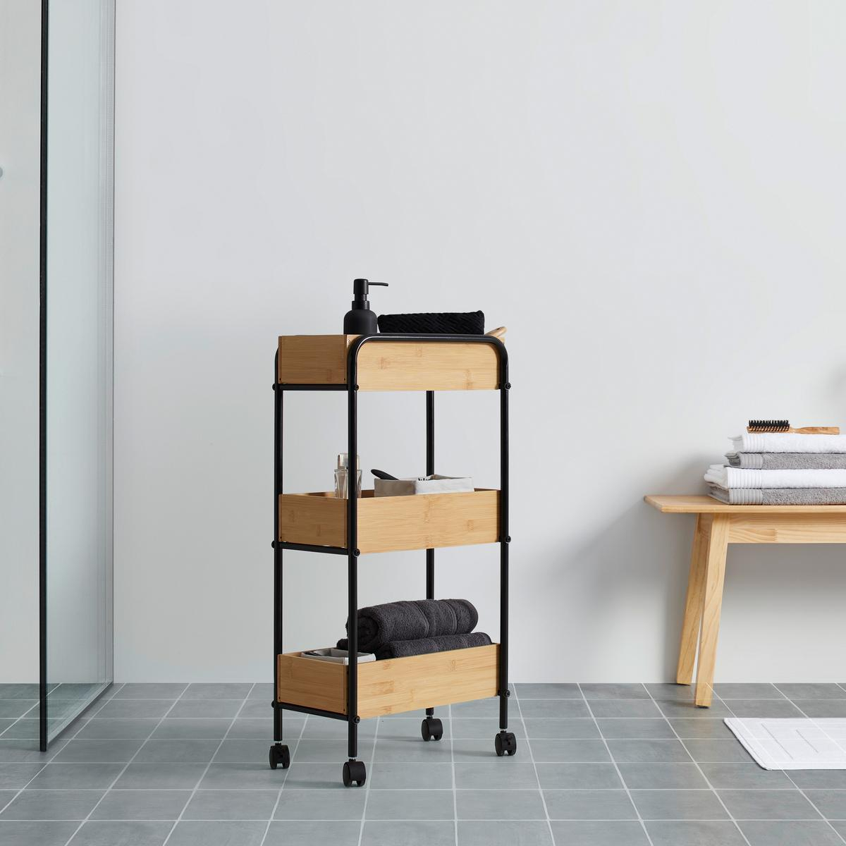 Această etajeră practică și elegantă combină farmecul materialelor naturale cu robustețea metalului. Cu un cadru din fier solid și rafturi din bambus 100%, este ideală pentru baie, bucătărie sau birou. Dotată cu 4 roți pentru o deplasare ușoară, dintre care două cu funcție de oprire, îți oferă flexibilitate și stabilitate acolo unde ai nevoie.