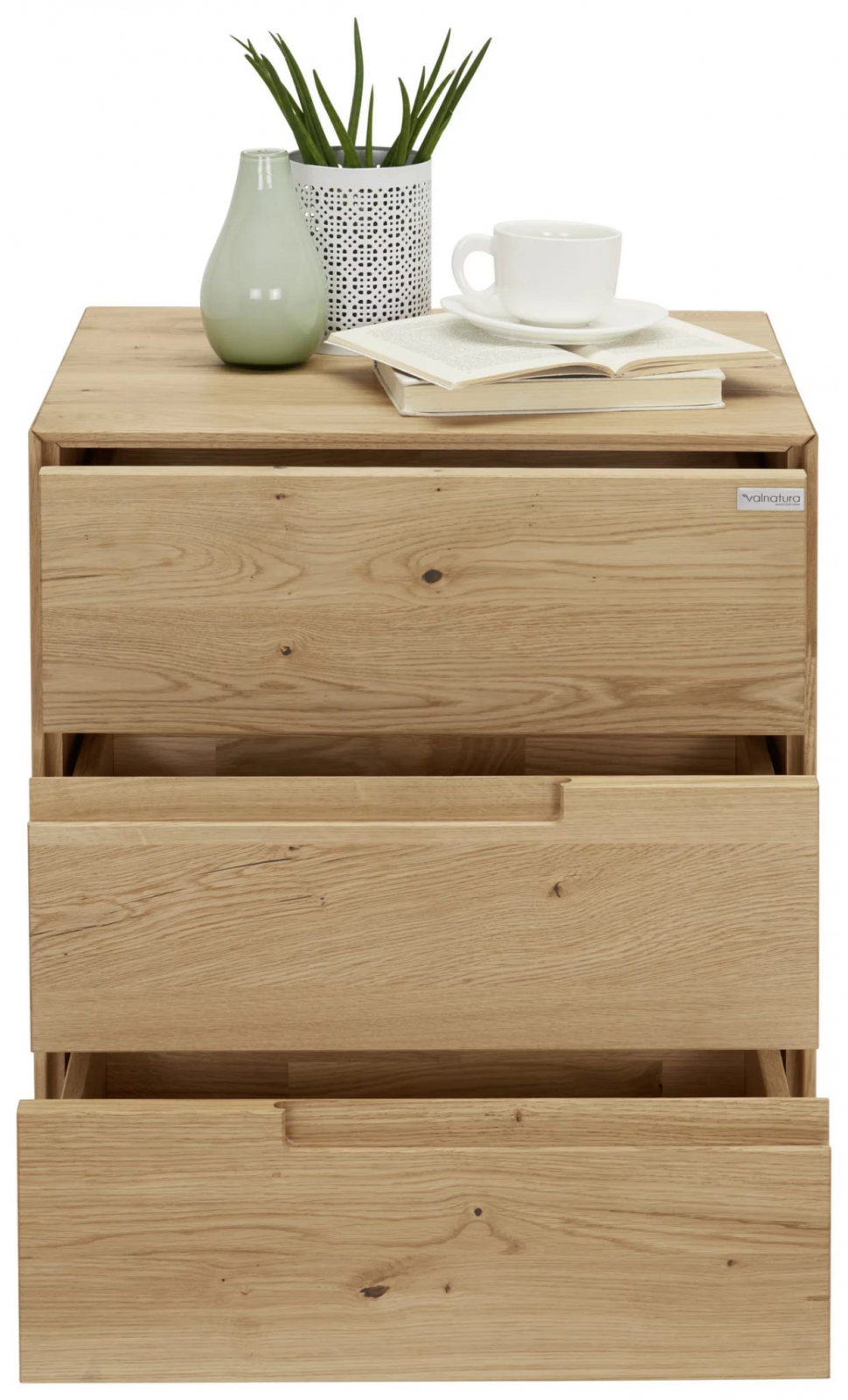 Cele trei sertare spațioase sunt dotate cu sistem de închidere soft-close, pentru o utilizare silențioasă și fără efort. Mânerele frezate, discrete și elegante, subliniază designul curat și natural al piesei.